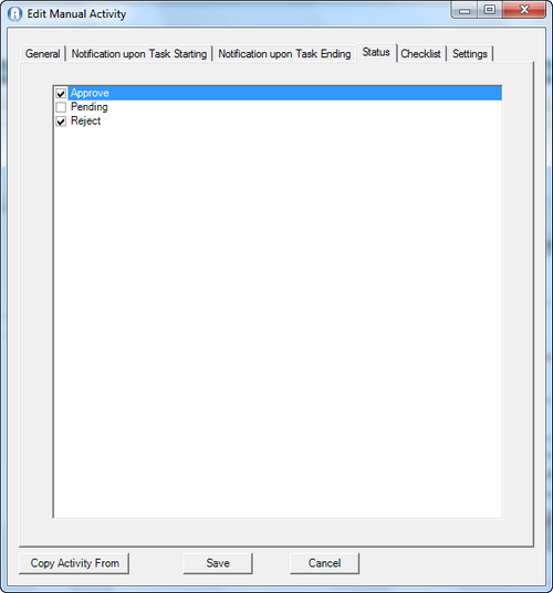Review: Check this checkbox if the activity is a “Review” type task. Information in the Status tab must be completed before this activity can be saved. If it is not checked, the fields such as Review Result and Review Notes will not be displayed for this activity when a workflow instance is running.