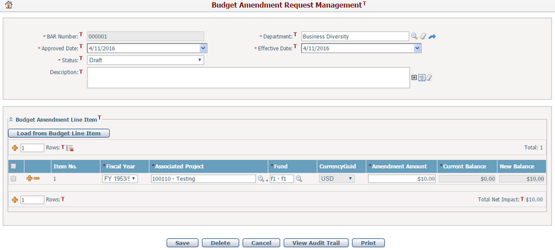 Click Delete button to delete the BAR. This button will be disabled when the status of the BAR is approved.