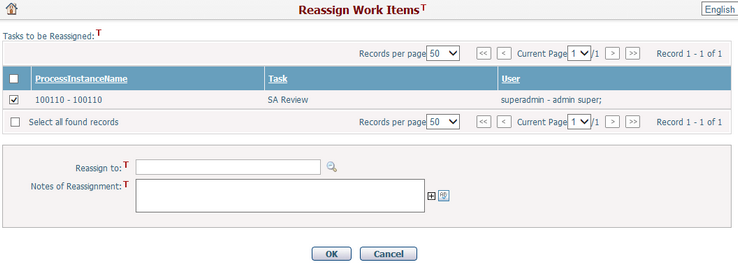 For tasks that you don't intend to accept, you can reassign them to another user by selecting the tasks and click the Reassign Selected Tasks icon . You will be directed to the Reassign Work Items page.