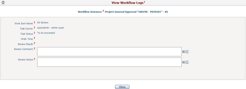 Last Review Result: The final Review Result of the instance. It is applicable to the “Review” type Workflow Process Types. Only the Completed instances will have Last Review Result. You can click the Close button to close this window. You can view the log details of an instance by clicking the View Details icon 1. Workflow logs are provided for New Tasks.