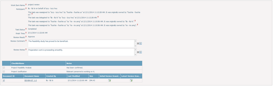 Finish Time: It is the time when the work item is completed. Only the Completed work items will have Finish Time. It is in Date/Time format. Review Result: The Review Result of the work item. It is applicable to the “Review” type activities (the "Review" checkbox is selected when editing an activity in Workflow Process Definition). Only the Completed work items will have Review Result. It will be blank if this is not a Completed work item. Note: This field will be invisible if it is not a “Review” type activity. Review Comment: The review comment of the work item. You can click the Expand icon Review Notes: The review notes of the work item. You can click the Expand icon The lower section lists all checklist items configured for this work item as well as their checking status in this worklfow instance. Only the Completed work items will show checklist. This section will be invisible if this is not a Completed work item. Each row lists each checklist item and its notes if applicable. The selected checkbox means the checklist item was checked by the participant in processing the work item, while the unselected checkbox means it was not checked. Documents submitted along with each workflow task will be listed under the Checklist data grid accordingly. For further details, you can download the initial version or the latest version of the document by clicking corresponding Download action icons, as needed. If the document associated with the submitted workflow task is deleted, the log for this workflow task will still list the deleted document. This will allow users' tracking all possible changes made to the workflow task. In this case, only the initial version of the document will be available for download.